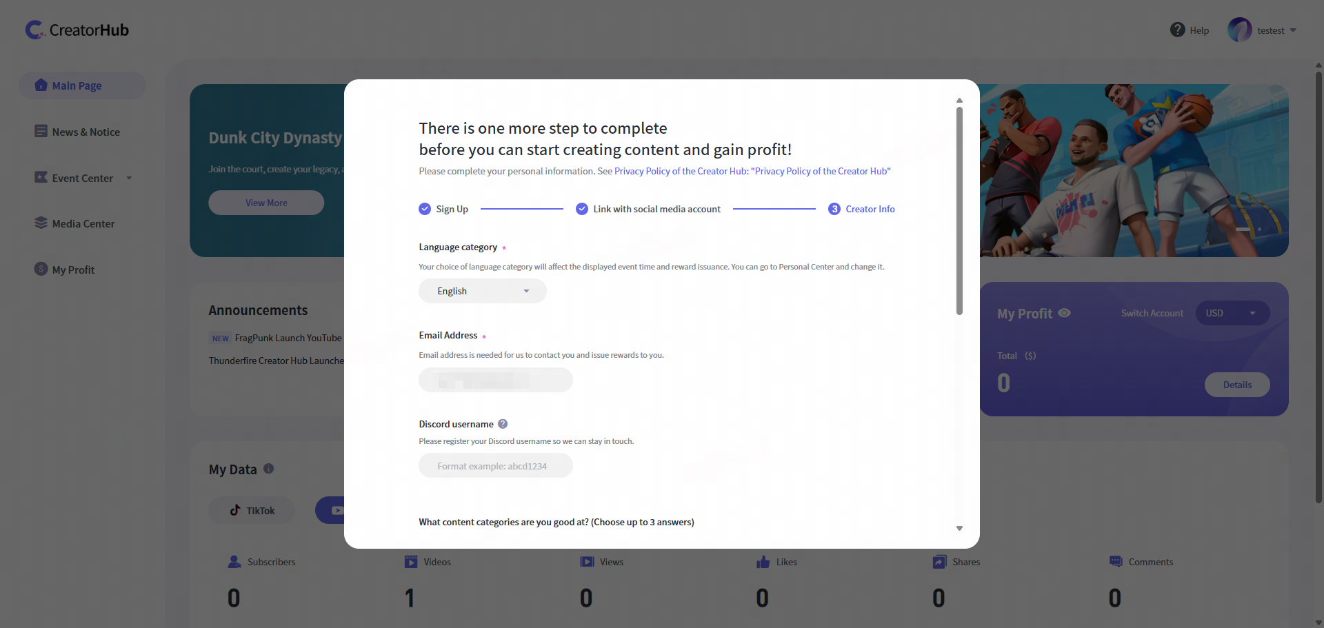 2. Set your preferences – Choose your content creation focus, preferred game genres, and confirm your submission region and email address.