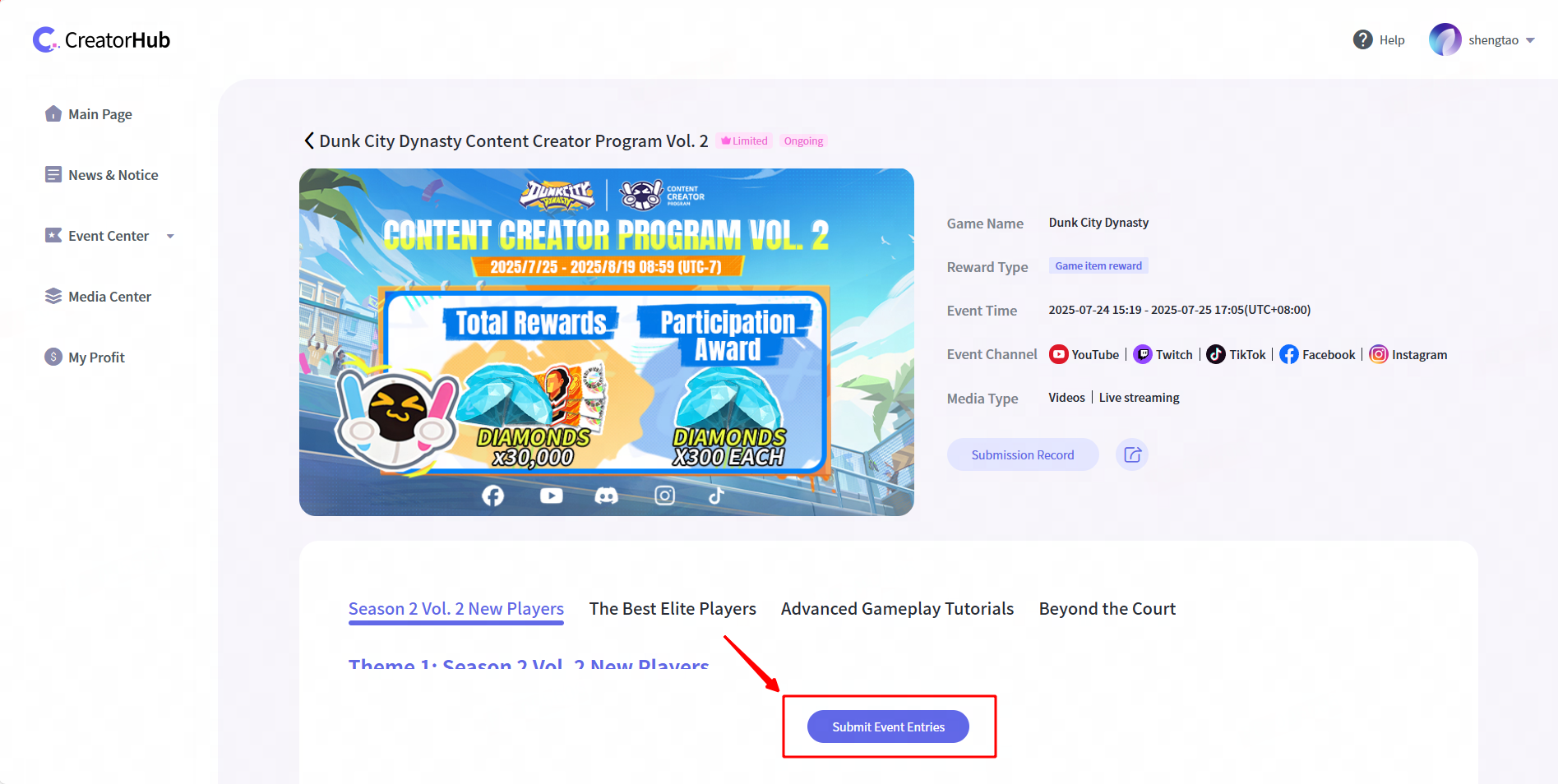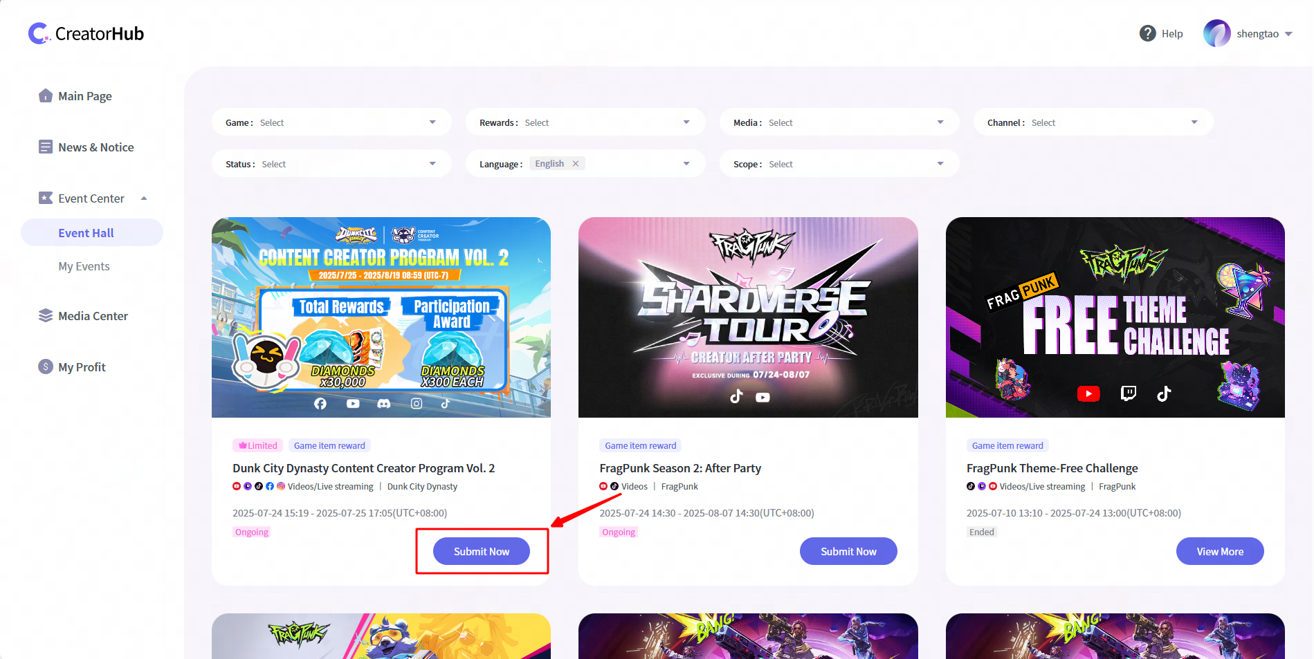 1. Log in to Creator Hub and go to the "Events Center - Event Hall" page. Browse ongoing events and use filters as needed.
