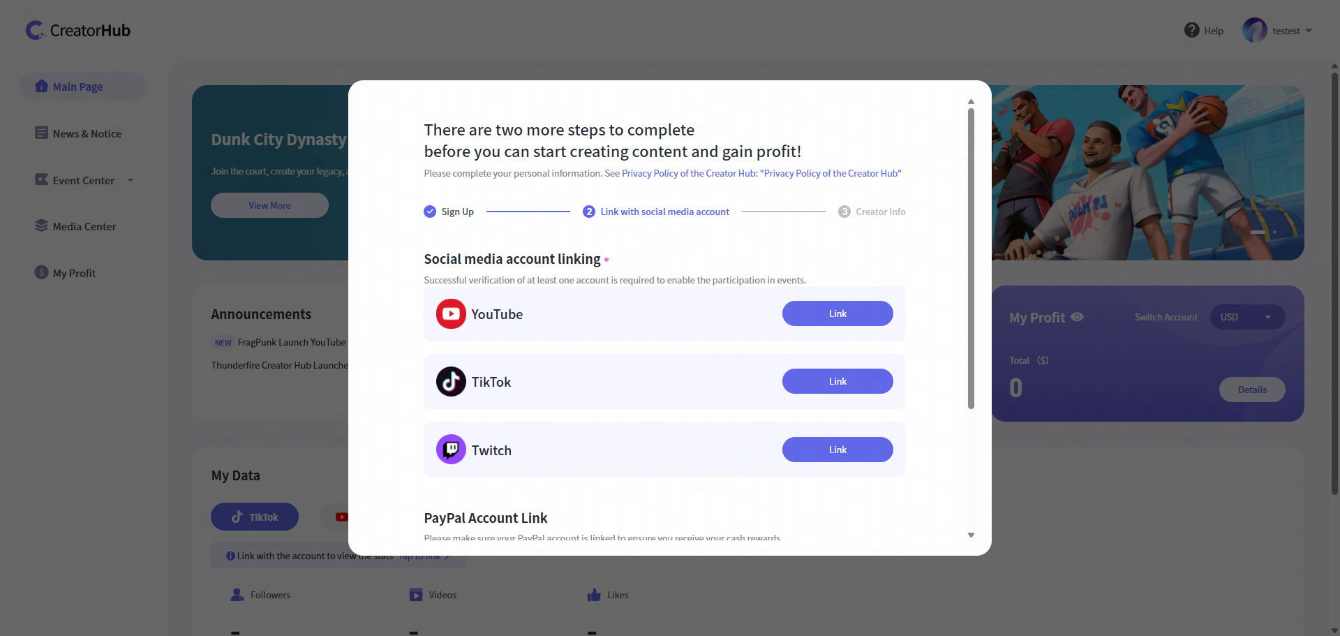 1. Link your accounts – Connect your social media, game account, and PayPal (at least one social media account is required to proceed).